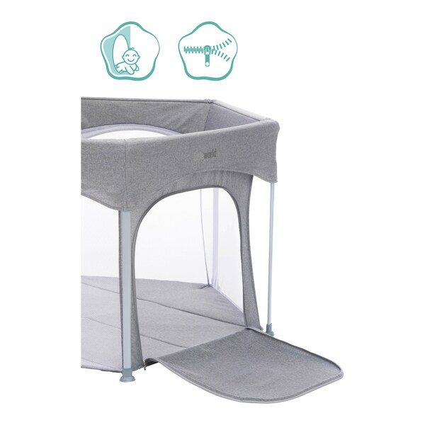 Sobald das Kind alt genug für ein selbstständiges Hinein- und Herauskrabbeln ist, punktet das Gitter mit einem praktischen Extra: Ein Seitenteil kann über einen Reißverschluss nahezu komplett bis auf Bodenhöhe geöffnet und nach oben aufgerollt und befestigt werden.