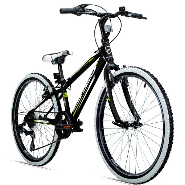Ein Mountainbike für Wald, Stadt und den Schulweg. Das Bergsteiger Kansas Mountainbike kommt in einem coolen Design daher. Es eignet sich hervorragend im Wald, im Stadtverkehr und sorgt auch auf dem Schulweg für unübertroffenen Fahrspaß. Die tolle Lackierung ist etwas für jeden Geschmack, denn das Mountainbike ist in mehreren Farben erhältlich. Mit dem Bergsteiger Kansas Mountainbike machst du richtig Eindruck bei deinen Freunden! Der Hi-Ten Stahlrahmen hat eine Rahmenhöhe von 24 cm und ist daher für Kinder ab einer Körpergröße von 110 cm geeignet. Die Weißwand Markenbereifung aus dem Hause Kenda bringt jede Menge Sicherheit, Grip und Qualität mit, was die V-Bremsen vorn und hinten ergänzen. Der MTB-Lenker am Konusvorbau verfügt über einen Drehgriff, der die 6 Gang Tourney Schaltung steuert. Mit dieser Schaltgetriebe wird jede Tour zu einer sportlichen oder komfortablen Angelegenheit: Du hast die Wahl! Jedenfalls ist die Schaltung sehr leichtgängig und einfach zu bedienen. Wenn dich das Fahrrad zuhause erreicht, ist es fast vollständig montiert. So steht deiner ersten Fahrt nichts mehr im Wege! Bergsteiger – Fahrräder die bewegen.