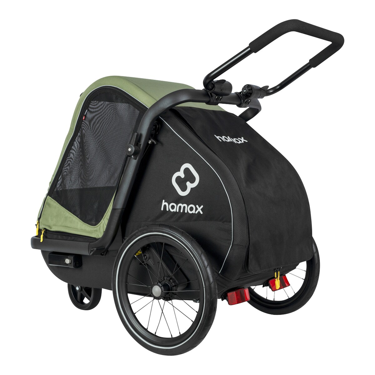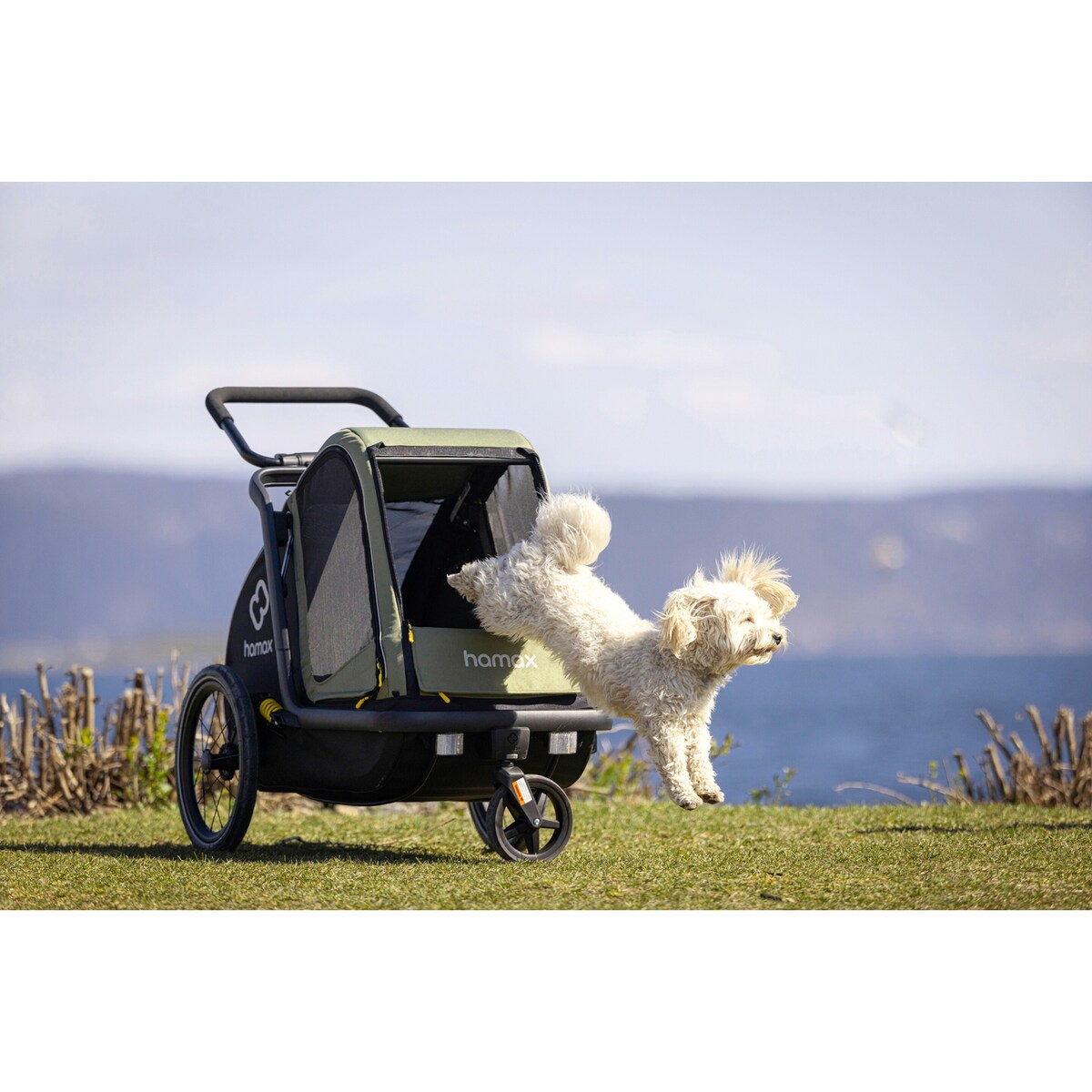 Der Hundeanhänger von Hamax sorgt für einen unkomplizierten Transport Deines Hundes. Ob Du mit dem Fahrrad oder E-Bike unterwegs bist, spielt keine Rolle: Du kannst beide mit der Kupplung verbinden. Gerade junge, alte oder kranke Hunde lassen sich so überallhin bringen. Im Set ist auch ein Buggy-Kit inbegriffen: Du kannst sekundenschnell ein Buggyrad anbringen, die Schiebegriffverlängerung montieren und schon kann es mit der Buggyvariante losgehen.
