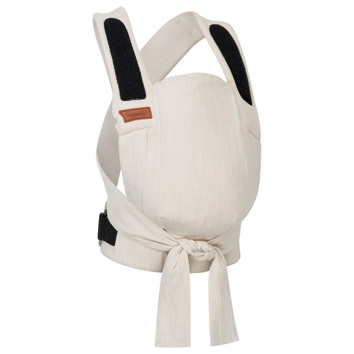 Der Bondolino wird unkompliziert mit einer Schnalle am Bauchgurt angelegt. Die Schulterträger werden hinter Deinem Rücken gekreuzt und mit einem Doppelknoten fixiert, wodurch sich die Trage an verschiedene Körpergrößen anpasst – ideal für Eltern mit Größenunterschied.