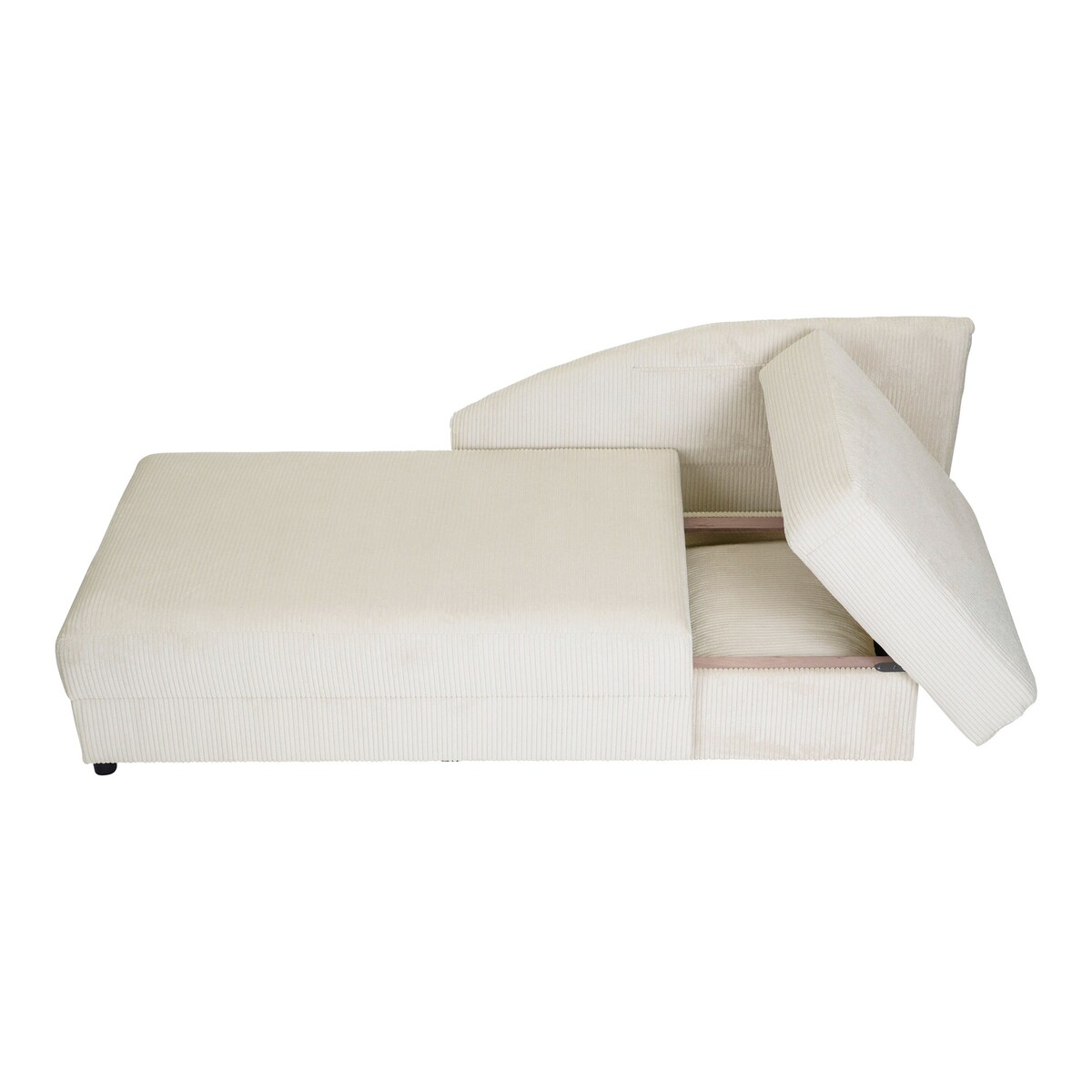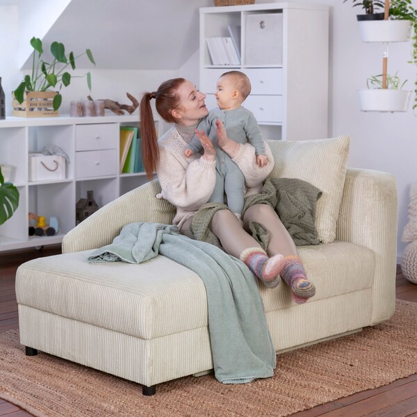 Zur Aufbewahrung von Kleinigkeiten wie Zeitungen oder Tablets verfügt die Recamiere über eine Seitentasche. Unterhalb der Sitzfläche befindet sich ein Stauraum für Bettzeug und Co. In ihm kann auch das zum Lieferumfang gehörende Kissen verstaut werden, wenn die die Recamiere Tobi als Schlafsofa verwendet wird.