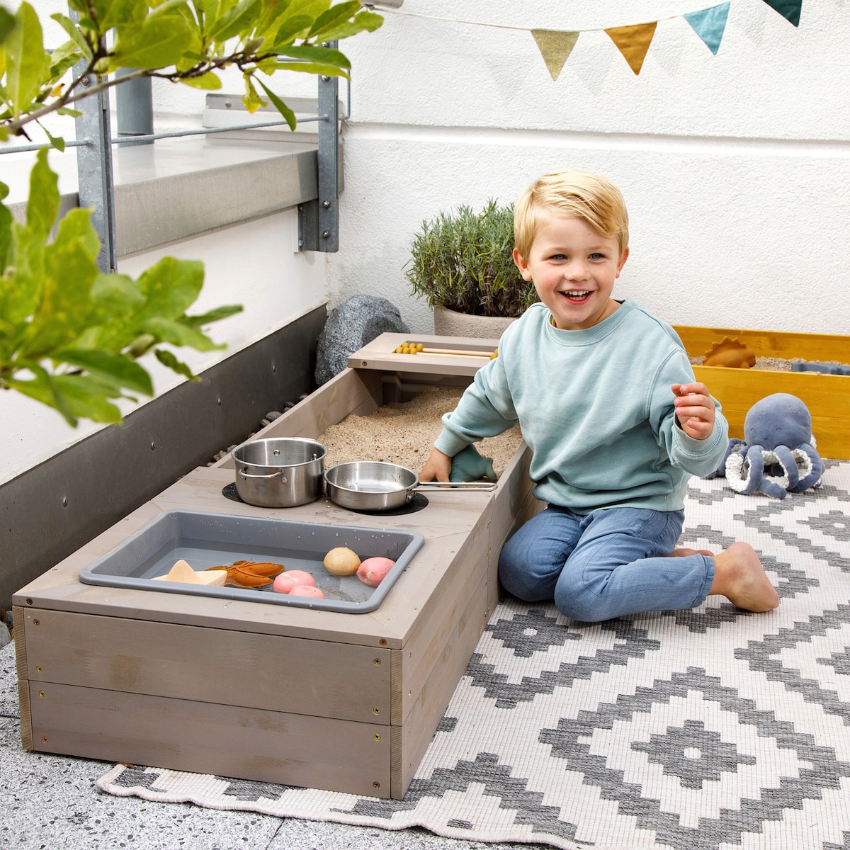 - 2 Kastenelemente flexibel arrangierbar, Staufach für Sandspielzeug unter der Sitzfläche, Matschwanne, Kochfeld mit 2 Herdplatten, Abakus mit 2 Reihen mit je 10 Perlen
