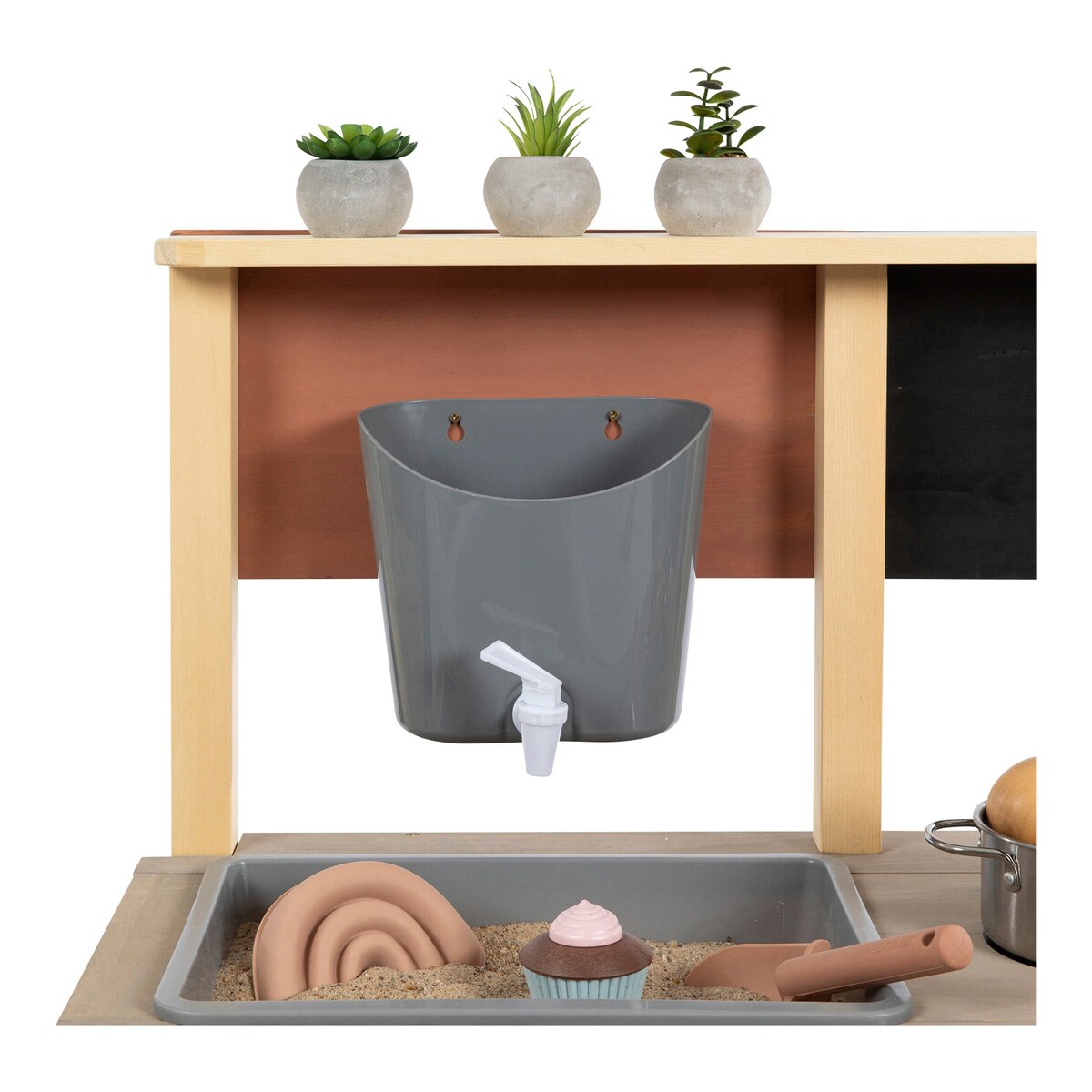 Der Wassertank Aqua Fun sorgt für Extraspaß in der Matschküche. Das praktische Accessoire kann einfach an der Rückseite der Küchenzeile befestigt werden. Es fasst bis zu eineinhalb Liter Wasser und lässt sich unkompliziert mit einer Gießkanne befüllen. Die Minis müssen nur den Hahn des Tanks öffnen, um das Wasser abzulassen.