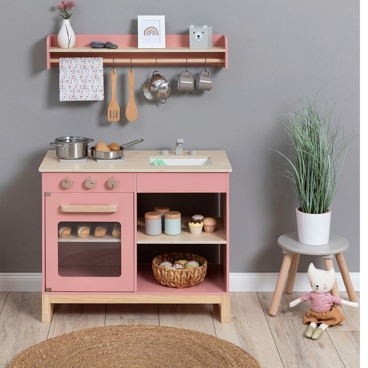 In der Kinderküche Magnolia von Musterkind können Kinder ab drei Jahren ihren Spaß am Kochen entdecken. Das im skandinavischen Stil designte Holzspielzeug bietet ihnen zwei Herdplatten und einen Ofen mit Klickgeräusch. Auch ein Backblech gehört zur Grundausstattung der Küche. Für den Abwasch steht den Minis ein kleines Waschbecken zur Verfügung. Kochutensilien wie Gewürze kann der Nachwuchs auf dem praktischen Hängeregal abstellen. Löffel, Siebe und Co. lassen sich dank der fünf Metallhaken hängend daran unterbringen.