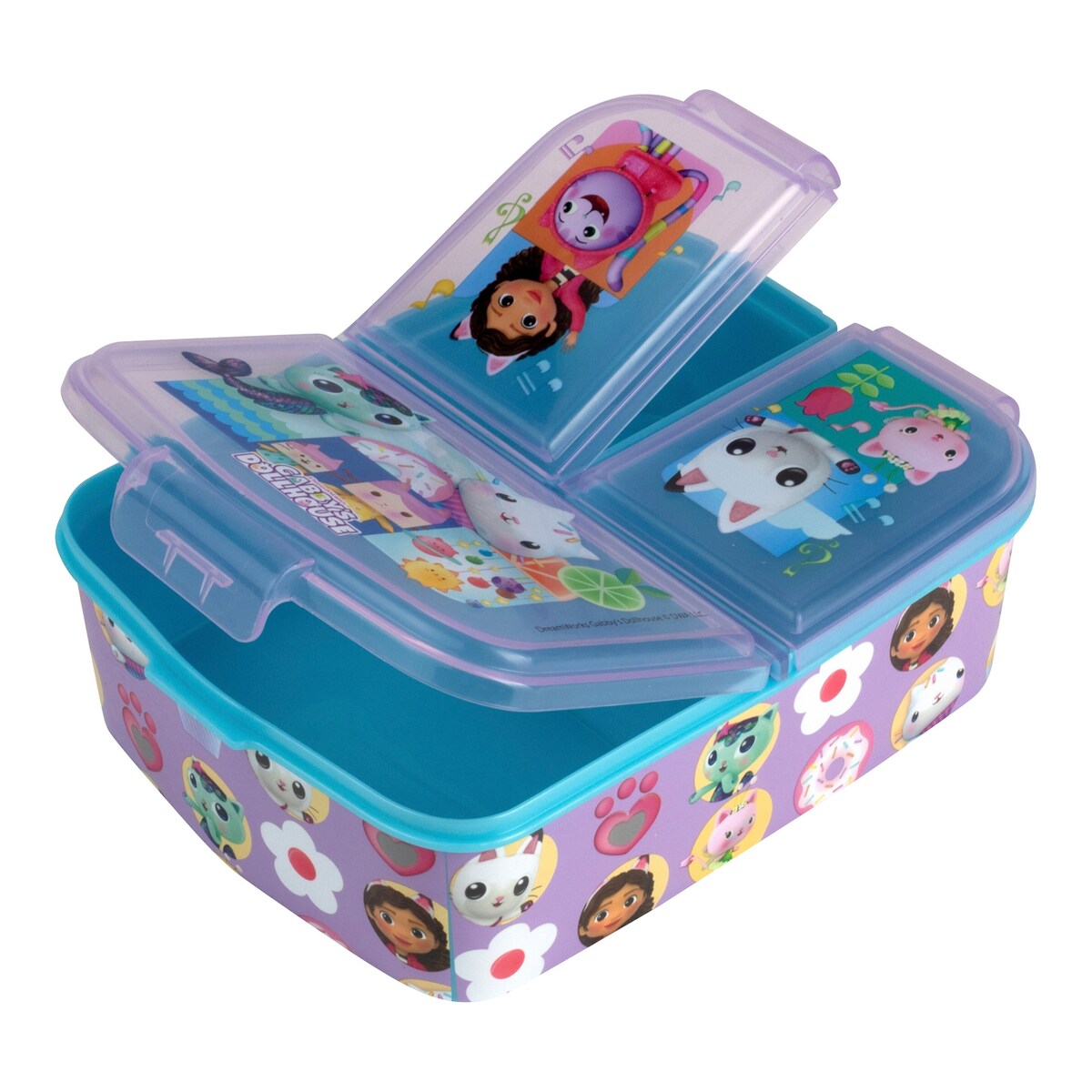 Die Brotdose von P:OS begleitet Fans der kleinen Katzenliebhaberin Gabby durch den Tag. Ganz gleich, ob die Kids auf dem Spielplatz unterwegs sind oder in der Kita: Mit der praktischen Dose sind leckere Snacks immer in greifbarer Nähe. Die Fächereinteilung ermöglicht es, süße und salzige, trockne und feuchte Speisen voneinander zu trennen. Auch nach einem langen Tag bleibt der Imbiss so appetitlich. Die Clip-Verschlüsse halten die Deckel zuverlässig an ihrem Platz. Sie lassen sich auch von kleinen Händen gut öffnen.