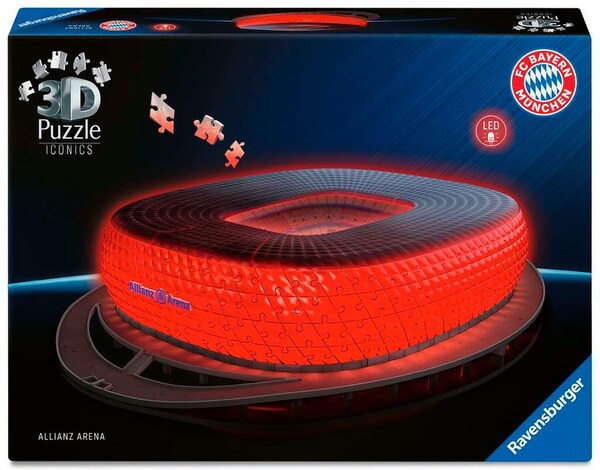 Nicht nur Fans des deutschen Rekordmeisters wird diese Nachbildung des berühmten Münchener Stadions zum Jubeln bringen. Sportfreunde und Groundhopper auf der ganzen Welt können sich das Wohnzimmer des FC Bayern aus dreidimensionalen Puzzleteilen nachbauen und in ihrem Zuhause ausstellen. Und das Beste: Dank des integrierten roten Leuchtbands sieht das Modell auch im Dunkeln so imposant aus wie das Original!