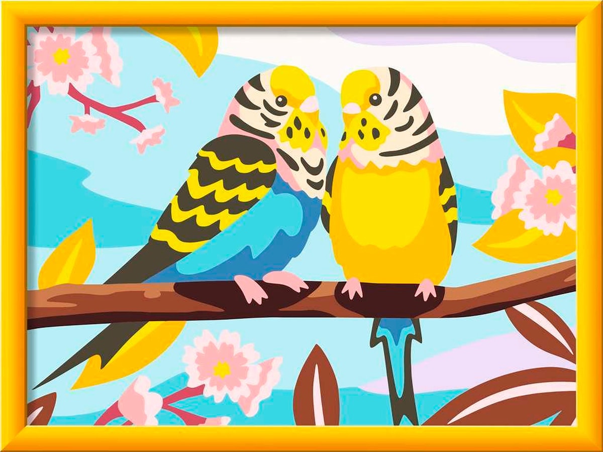 Dank der farbigen Motivlinien, können die Kinder das ganze Motiv Bunte Wellensittiche und die Farben schneller erkennen. Der Pinsel hat eine gute Führung und so entsteht ein perfektes Bild.