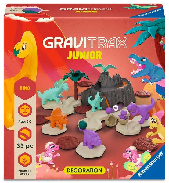 Die GraviTrax Junior Extension Dino ist eine optimale Erweiterung des Kugelbahnsystems. In Kombination mit einem GraviTrax Junior Starter-Set tauchen Kinder ab 3 Jahren sofort in die Welt der Dinosaurier ein. Die vielfältigen Dino-Figuren, der spektakuläre Vulkan und weitere Elemente aus der Dinowelt sorgen für grenzenlosen Bau- und Spielspaß. Alle Bauteile bestehen aus Holz-Biokunststoff.