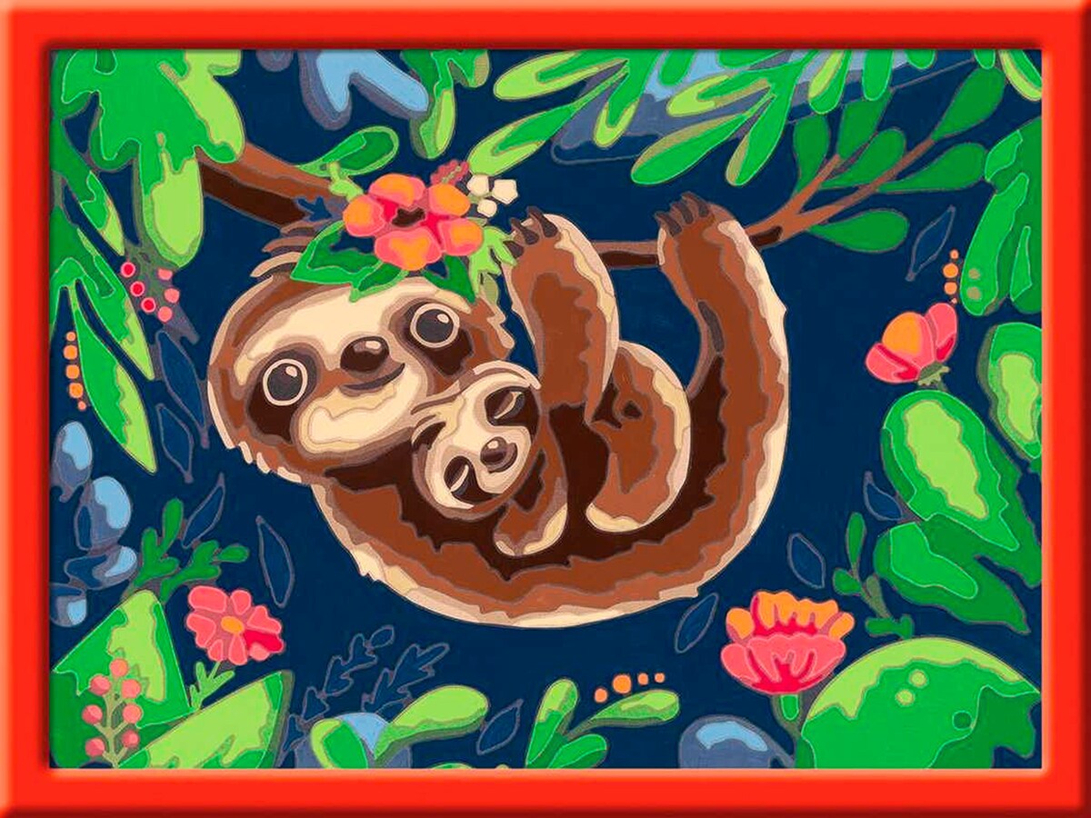 Dank der farbigen Motivlinien, können die Kinder das ganze Motiv Niedliche Faultiere und die Farben schneller erkennen. Der Pinsel hat eine gute Führung und so entsteht ein perfektes Bild.