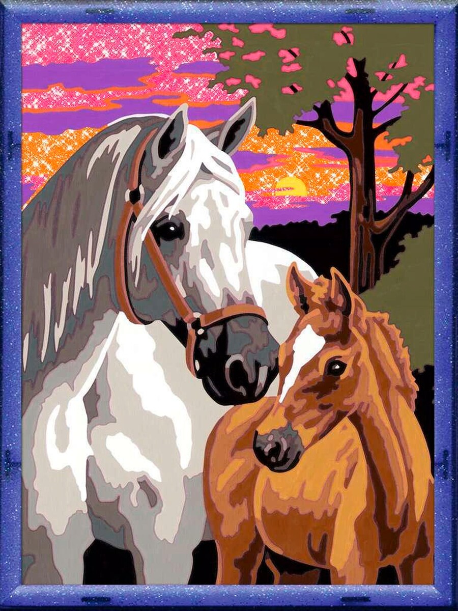 Dank der farbigen Motivlinien, können die Kinder das ganze Motiv Pferde im Sonnenuntergang und die Farben schneller erkennen. Der Pinsel hat eine gute Führung und so entsteht ein perfektes Bild.
