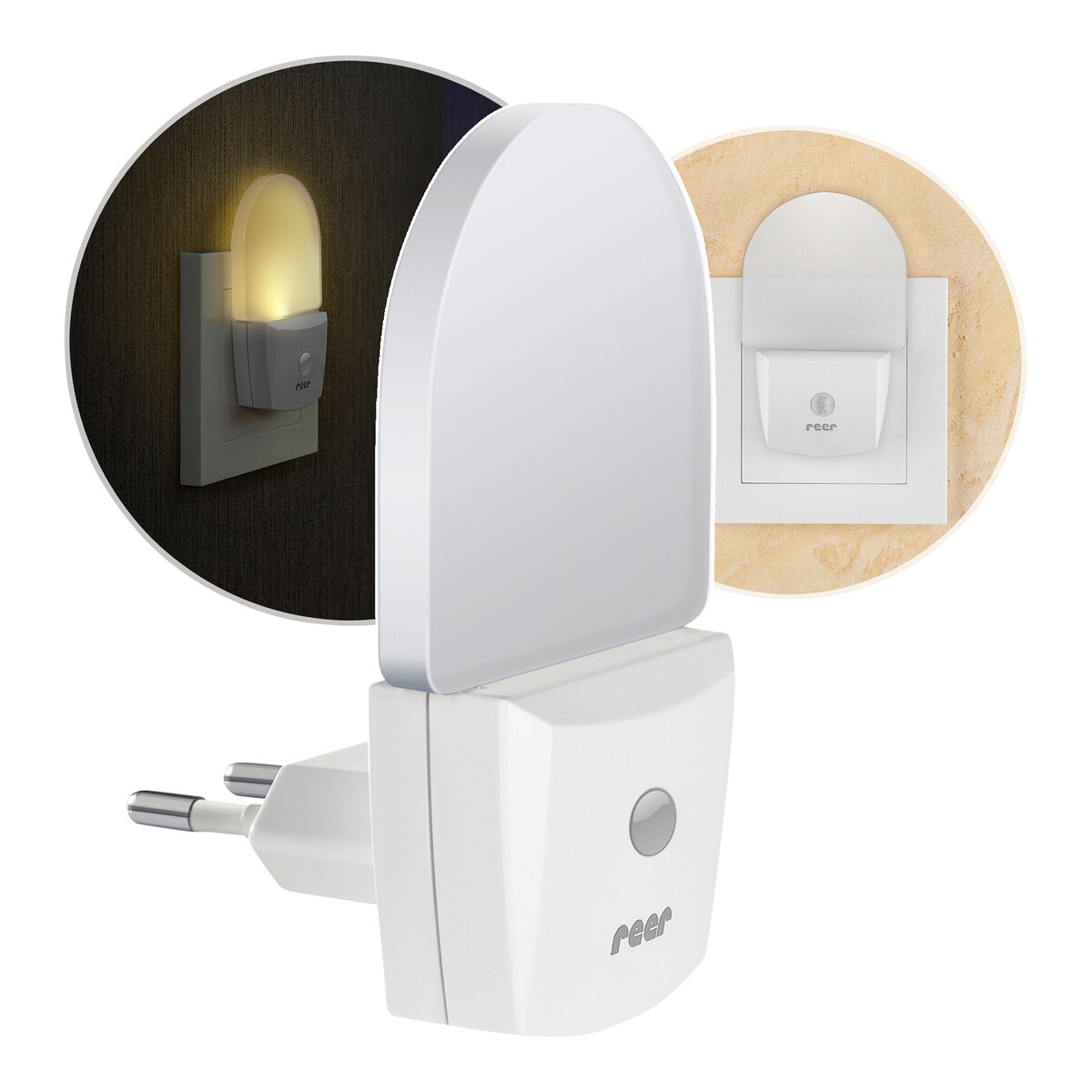 Das LED-Nachtlicht Nightguide von Reer beruhigt mit seinem warmweißen Licht sanft die Kleinen. Es verfügt über einen praktischen Dämmerungssensor, der die Lampe bei Einbruch der Dunkelheit einschaltet.