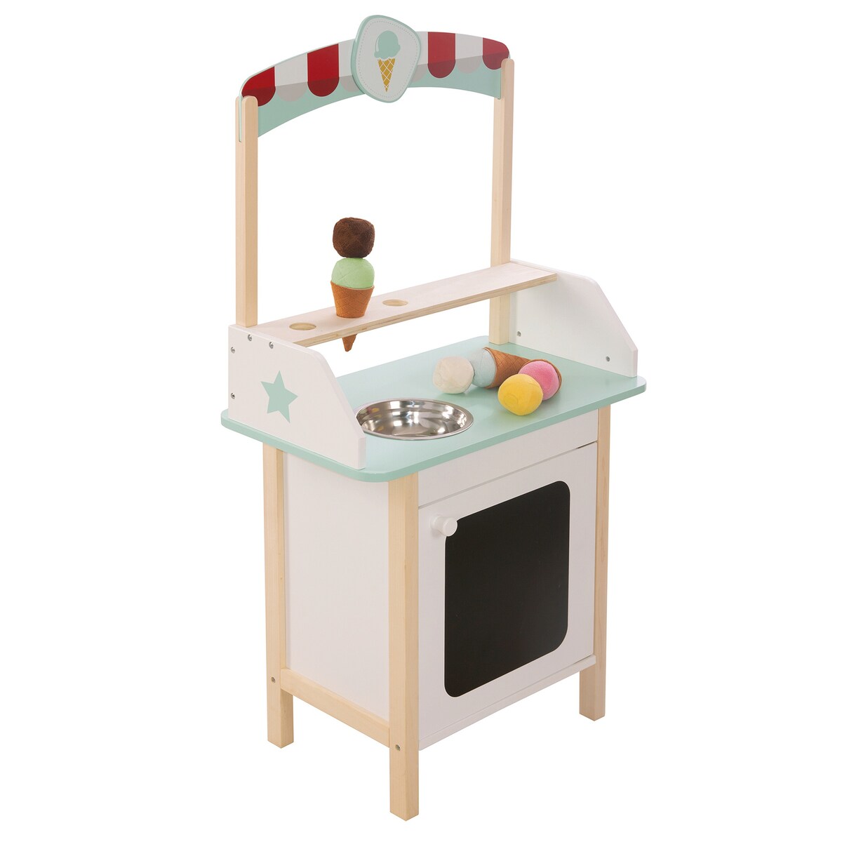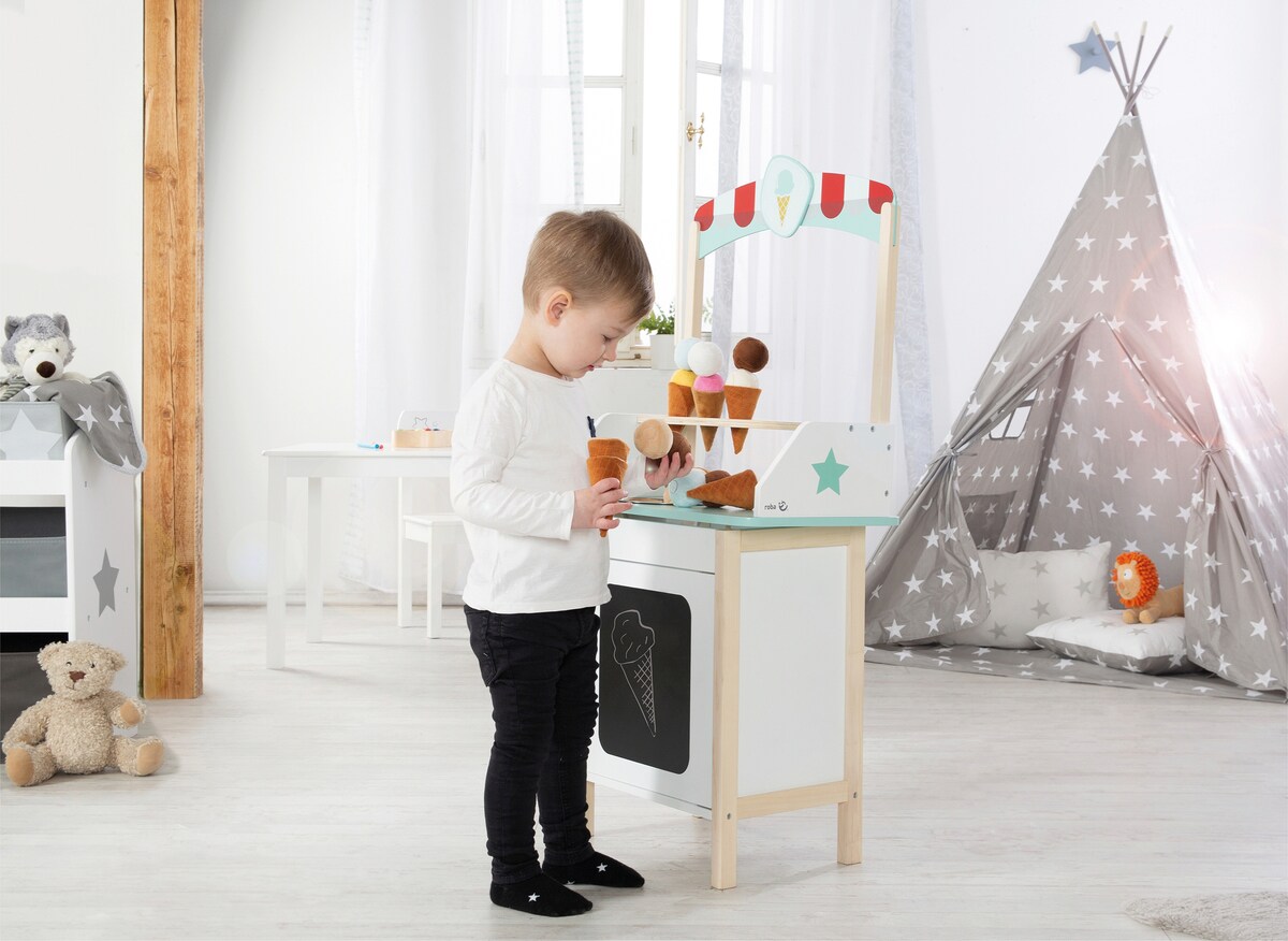 Der roba Eisstand mit Zubehör im niedlichen Retro-Look bringt nicht nur die Augen kleiner Eisverkäuferinnen und Eisverkäufer zum Leuchten. Der Eisstand ist zudem eine schöne Ergänzung zur Kinderküche oder zum Kaufladen und ein tolles, pädagogisches Lernspielzeug aus Holz. In eine andere Rolle zu schlüpfen fördert bei Kindern die soziale Kompetenz. Der roba Eisstand ist bewusst dezent gestaltet damit der Fantasie der Kleinen genügend Raum für eigene Ideen gegeben wird. So können die Kleinen ihrer Fantasie freien Lauf lassen, wodurch die Kreativität gefördert wird. Der Eiscremestand ist in Weiß und einem pastelligen Hellblau lackiert und seitlich mit je einem Stern bedruckt. Natürlich benötigt der Eisstand als Firmen-Logo eine liebevoll gestaltete Eistüte! In der Metallschüssel finden die 6 Eiskugeln aus Plüsch ihren Platz. Es gibt je eine Kugel Schoko, Vanille, Banane, Apfel, Schlumpf und natürlich darf Erdbeere nicht fehlen. Die weichen Plüsch-Eiskugeln lassen sich mittels Magnetes verbinden. So lernen die Kleinen spielerisch mit Nahrungsmitteln umzugehen. Die 3 Stoffeiswaffeln finden ihren Platz in den Aussparungen oben an der Theke des Eiscremestands. Hinter der Tür befinden sich zwei Fächer, in denen z.B. Spielsachen verstaut werden können. Vorne an der Tür befindet sich eine Fläche aus Tafellack, auf der die kleinen Leckermäulchen ihre Notizen machen können. Manche bestellen am Eiscremestand vielleicht Schoko und Erdbeere andere kombinieren lieber Banane mit Apfel. Der roba Eisstand mit 9-teiligem Zubehör-Set wurde nach der europäischen Sicherheitsnorm für Spielzeug EN 71-1:2014 + A1:2018 in Deutschland entwickelt und ist EPH zertifiziert. Alle verwendeten Materialien sind schadstoffgeprüft, zertifiziert und unterliegen strenger Kontrolle. Die Oberflächen sind abwischbar und pflegeleicht. Der roba Eisstand ist als Rollenspielzeug für Kinder ab 3 Jahren geeignet. (HxBxT) 103 x 52 x 30 cm.