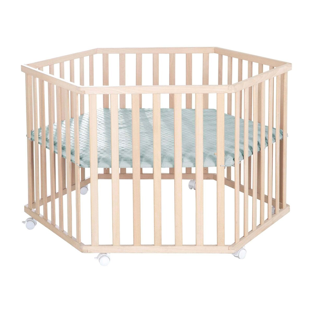 Entdecken Sie das hochwertige roba Laufgitter 6-eckig 'Lil Planet' frosty green – die perfekte Kombination aus Sicherheit, Komfort und modernem Design für Ihr Baby. Der stabile Laufstall aus naturbelassener Buche ist besonders langlebig, pflegeleicht und schadstofffrei. Mit einer komfortablen Höhe von 72 cm und einem großzügigen Außen-Durchmesser von 121 cm bietet das sechseckige Laufgitter ausreichend Platz zum Spielen, Krabbeln und Entdecken. Die 3-fach höhenverstellbare Bodenplatte (10 cm, 25 cm, 40 cm) lässt sich flexibel an die Entwicklungsphase Ihres Kindes anpassen – ob Neugeborenes oder aktives Kleinkind. Dank der sechs leichtgängigen Bremsrollen bleibt das Laufgitter mobil und kippsicher zugleich – ideal für den flexiblen Einsatz in verschiedenen Wohnräumen. Die im Lieferumfang enthaltene, weich gepolsterte Laufgittereinlage aus Bio-Baumwolle im Design 'Lil Planet' ist besonders hautfreundlich und sorgt für zusätzliche Geborgenheit. Das roba Laufgitter entspricht der aktuellen Sicherheitsnorm EN 12227:2010-12 und ist kompatibel mit ergänzenden Laufgittermatratzen. Eine durchdachte Lösung für Eltern, die Wert auf Qualität, Sicherheit und stilvolles Design legen.