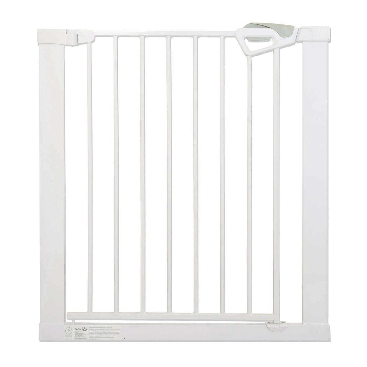 Das TÜV-geprüfte roba easySafe+ Tür- & Treppenschutzgitter bietet zuverlässigen Schutz für Kinder im Haushalt und schafft sichere Grenzen an Treppenaufgängen, Türrahmen oder Durchgängen. Der innovative Ampel-Sicherheitsverschluss gibt eine visuelle Rückmeldung über die sichere Verriegelung: Grün bedeutet, das Gitter ist korrekt geschlossen. Die einfache Einhandbedienung ermöglicht ein komfortables Öffnen und Schließen in beide Richtungen, was den Alltag mit Kind deutlich erleichtert. Für zusätzliche Sicherheit sorgt der automatische Schließmechanismus in Kombination mit einer praktischen 90°-Stoppfunktion, die das Gitter in geöffneter Position fixieren kann. Die Montage erfolgt ganz flexibel: Entweder bohrfrei per Klemmbefestigung – ideal für Mietwohnungen – oder alternativ mit Schraubbefestigung für dauerhaft stabilen Halt. Das Gitter besteht aus robustem, pulverbeschichtetem Metall, ist 80 cm hoch und hat im Grundmodell eine variable Breite von 75 bis 82 cm (Breite der Klemmschrauben inklusive). Mit separat erhältlichen Verlängerungen von 7 cm (Art. Nr. 215949WE) und 14 cm (Art. Nr. 215950WE) lässt sich das System auf bis zu 110 cm erweitern – wahlweise einseitig oder beidseitig montiert. Auch in Kombination mit Rundholmen ist das Gitter dank separat erhältlicher Y-Spindeln (Art. Nr. 215951SI) problemlos einsetzbar. Es eignet sich für Kinder im Alter von 0 bis 24 Monaten und erfüllt die Sicherheitsanforderungen der Norm EN 1930:2011. Entwickelt wurde das Produkt in Deutschland.