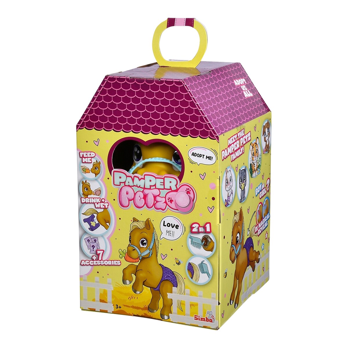 Das niedliche Fohlen Pamper Petz Pony mit den großen Augen kann richtig trinken. Ein magisches Muttermal zeigt das Geschlecht des Ponys an. Der Schweif ist kämmbar. Drei Überraschungen warten auch noch darauf, entdeckt zu werden. Das Spielzeig begeistert Kinder ab drei Jahren.