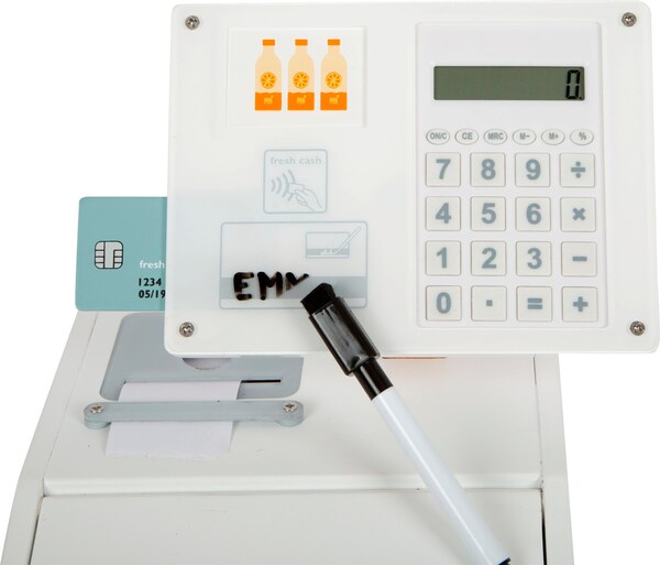 Eine einzigartige, optisch moderne Holzkasse, die mit viel Zubehör und zahlreichen Funktionen das Einkaufen im Kaufmannsladen noch realistischer macht! Ausgestattet mit Handscanner, Papier-Bonrolle, Monitor, aufklebbarer Scanfläche, Geld- und Produktkarten sowie doppelseitig bedruckten Geldstücken aus Holz lässt diese Spielkasse keine Wünsche offen. Highlights sind der in den Monitor integrierte, echte Taschenrechner sowie das zweigeteilte Kassenfach, das sich wie eine echte Supermarkt-Kasse nach oben hin öffnen lässt. Inkl. abwischbarem Stift mit integriertem Schwamm zum Unterschreiben auf der Acrylglasfläche. Es wird 1x Knopfzelle LR1130 benötigt. Batterie nicht enthalten. Abkassieren wie im Supermarkt? Dann darf diese Spielkasse aus der Produktlinie „fresh“ in einem gut sortierten Kaufmannsladen auf keinen Fall fehlen! Die aufklebbare Scanfläche kann dazu ganz einfach auf einen bestehenden Kaufladen oder eine andere Spielfläche aufgeklebt werden. Das spielerische Kassieren trainiert den Umgang mit Geldbeträgen und Preisen und die 15 Geldstücke sind so gestaltet, dass sie zum Üben erster Rechenoperationen genutzt werden können. Auch die 5 beidseitig bedruckten Lebensmittelkärtchen animieren zum Zählen und Rechnen lernen. Wer lieber tippt, statt zu rechnen, kann die Preise für gekaufte Waren ganz einfach über die Tastatur des integrierten, echten Taschenrechners eingeben. Die hochwertige Verarbeitung mit robustem Holz und Acrylglas macht die Kaufladen-Kasse zu einem echten Hingucker im Kinderzimmer, der langanhaltenden Spielspaß verspricht!