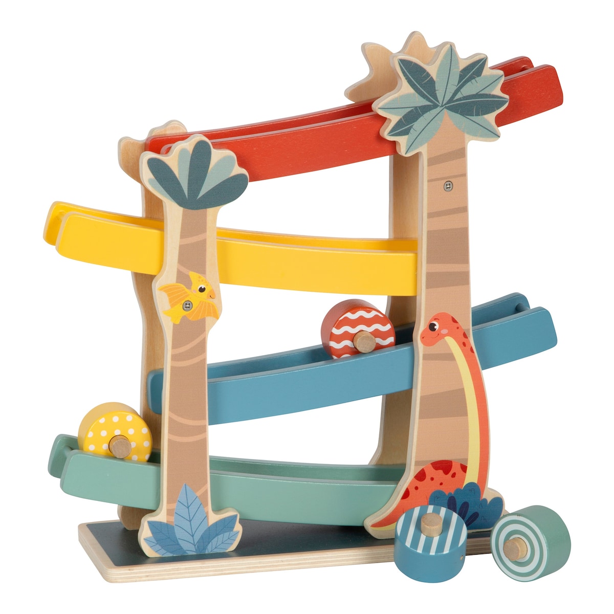 Die Kugelbahn Dino von Small Foot bietet kleinen Fans großer Urzeitechsen jede Menge Spaß: Ab circa 18 Monaten können die Minis die vier bunten, gemusterten Holzräder über die Rampen sausen lassen. Sobald sie im Ziel angekommen sind, kann das Spiel von vorn beginnen.