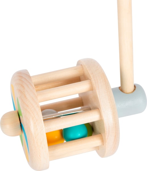 Die Schieberassel aus Holz ist ein sicherer und strapazierfähiger Begleiter für jedes Kleinkind und der unangefochtene Klassiker unter den Schiebespielzeugen! Beim Loslaufen kullern die farbenfrohen Holzkugeln im Inneren der Holztrommel wild umher und erzeugen ein lustiges Geräusch, das kleine Laufanfänger zu immer neuen Erkundungstouren durchs Kinderzimmer animiert. Durch die griffige Holzkugel am Griff lässt sich der praktische Laufbegleiter sehr gut führen. Ein wunderbares Holzspielzeug für kleine Kinder, die gerade das Laufen für sich entdeckt haben und gern aktiv sind. Ermutigt Laufanfänger durch die in der Trommel aufgeregt umherpurzelnden Holzkugeln, sich ständig in Bewegung zu halten. Beim Schieben entsteht durch den seitlichen Aufdruck ein optisches Farbspiel.