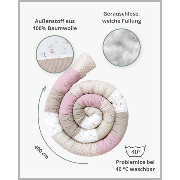Die Nestchenschlange von Ullenboom ist weich gefüllt und kann flexibel gelegt werden. Mit einer Länge von 400 Zentimetern und ihrer perfekten Breite passt sie als Polsterung und Seitenschutz in ein Baby- oder Beistellbett. Gleichzeitig schützt die Nestchenschlange vor Zugluft und kann ebenso als Kantenschutz oder zum Kuscheln genutzt werden. Der Oberstoff aus Baumwolle ist angenehm weich, schadstoffgeprüft und antiallergisch. Dank der hochwertigen Füllung entstehen keine Geräusche oder Rascheln beim Bewegen. Praktisch: Die Schlange kann in der Maschine gewaschen werden. 20 Stoffstreifen mit unterschiedlichen Mustern sorgen für ein unverkennbares Design.