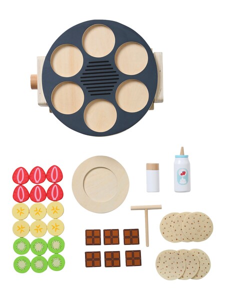 Im Set enthalten: 1 Crêpes-Platte aus Holz, 6 Filz-Crêpes, 1 Dose Sprühsahne, 1 Zuckerstreuer, 1 Teller, 1 Wender, 6 Bananenscheiben, 6 Erdbeerscheiben, 6 Kiwischeiben, 6 Stücke Schokolade