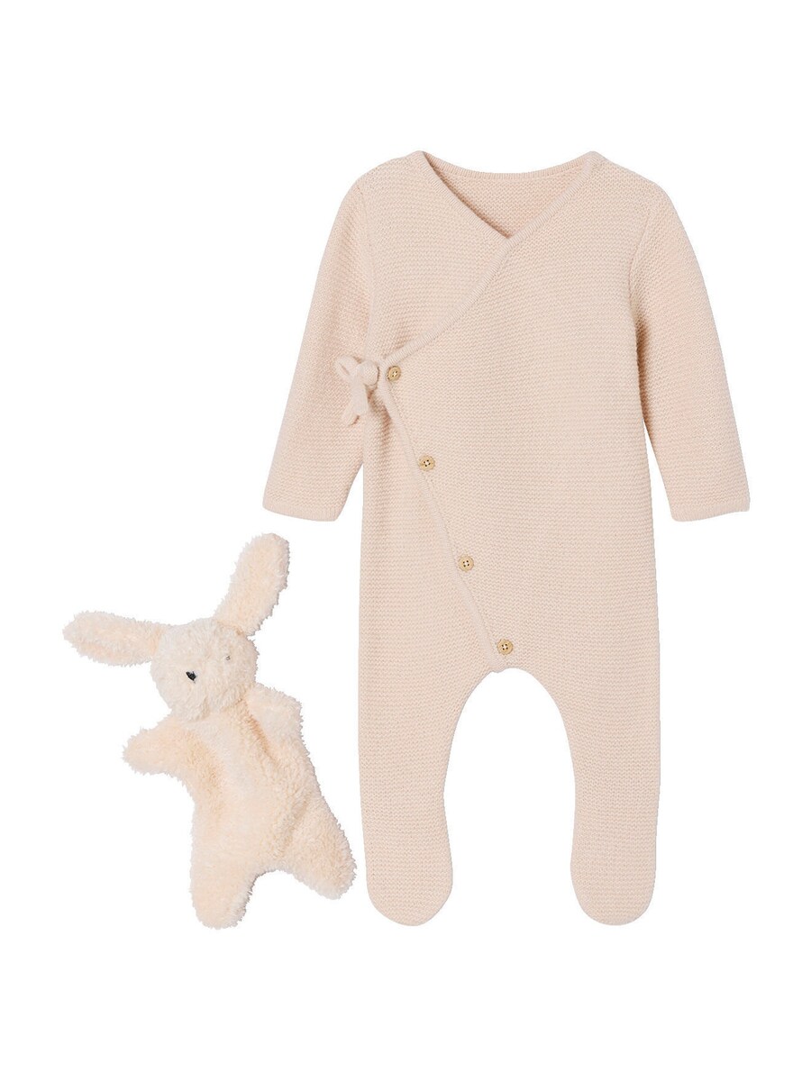 Baby Geschenk-Set: Overall, Mütze & Plüschhase beige meliert