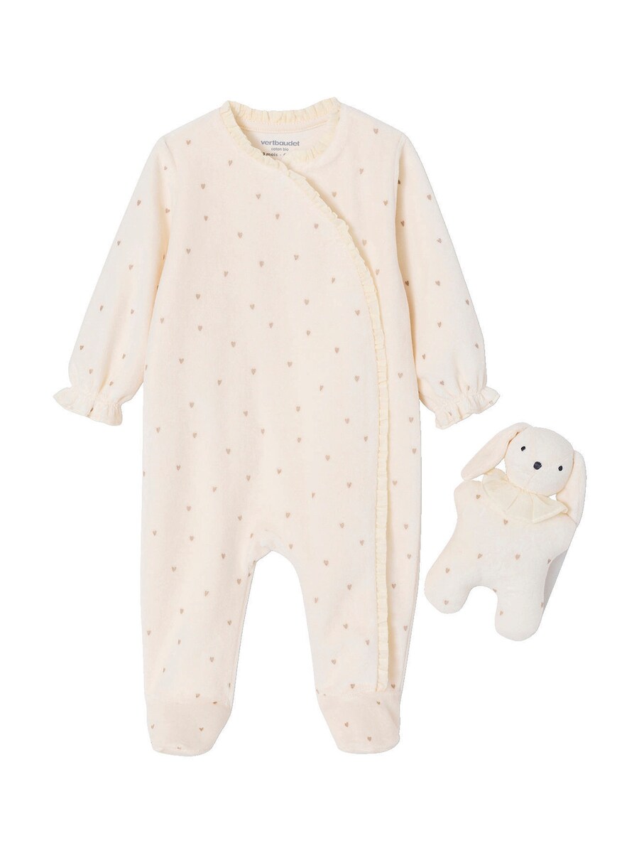 Baby Schlafanzug und Kuscheltier-Set aus Samt, Geschenkbox zur Geburt wollweiß